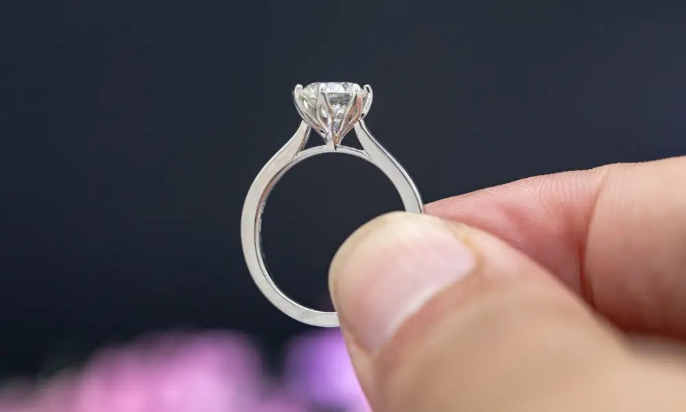 As previously stated, a high setting can make a diamond appear larger than it actually is. A high setting is most noticeable when worn with a thin ring shank or band, as shown in the example below.