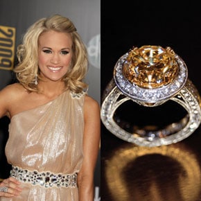 Carrie Underwood has been sporting a gorgeous 5 carat yellow diamond since hockey star Mike Fisher proposed in 2009. Slightly darker in hue than typical canary diamonds, this is an incredibly beautiful round stone set with a halo of white diamonds. Some say her stylist suggested a yellow diamond to compliment her beautiful golden locks.