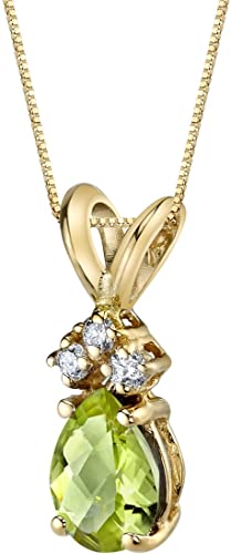 - WOMEN’S TIMELESS PERIDOT JEWELRY – Our Peora 14K Gold Pendants Collection has given the traditional solitaire favorite a vibrant twist. Natural Peora Peridot, Pear Shape, 7x5mm, 0.70 Carat, with its characteristic Rich Leaf Green tint for a rich radiance. Handcut checkerboard faceting, punctuated with 0.06 carat total of real Round Brilliant Cut Diamonds from the Past, Present, and Future, set in 14 Karat Yellow Gold for maximum gleam.