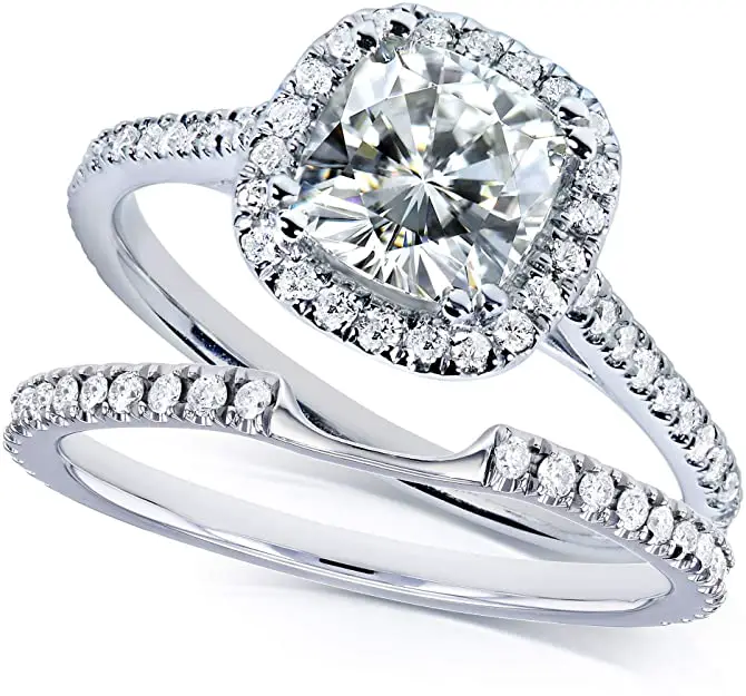 - All Genuine Lab Grown Diamonds and Moissanite Solid 14k White Gold Metal Halo Moissanite and Diamond Bridal Set
