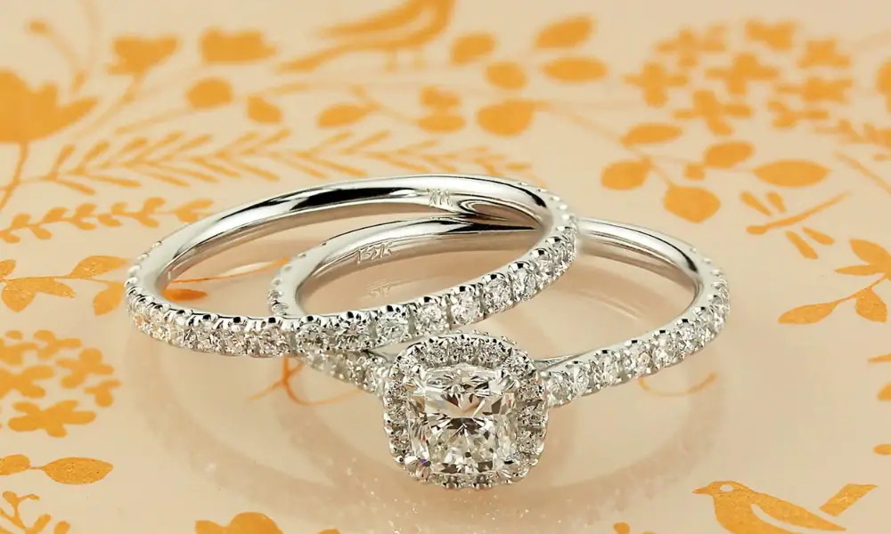 - Women’s wedding ring sets are made of AAAAA Cubic Zirconia imitation diamonds. White gold plated rings that resemble natural diamond rings in appearance and glitter.