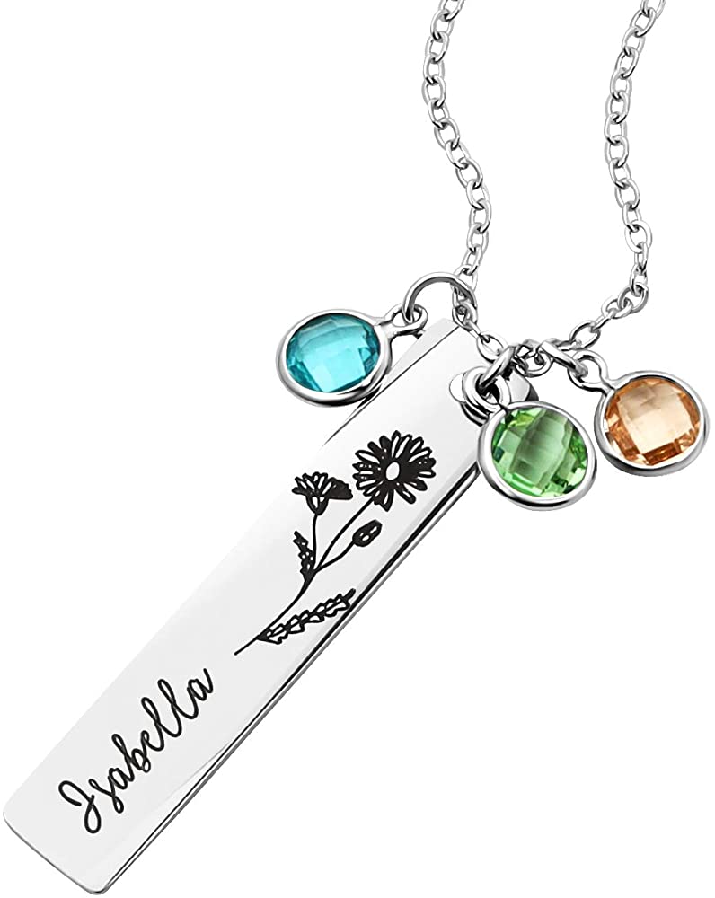 Silver Custom Birthstone Necklace Birth Flower Name Personalized Gift for Her Bar Name Necklace for Mom Mothers Day Gift Floral Jewelry Handmade Jewelry -8N-FLBS-S