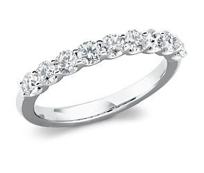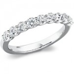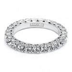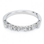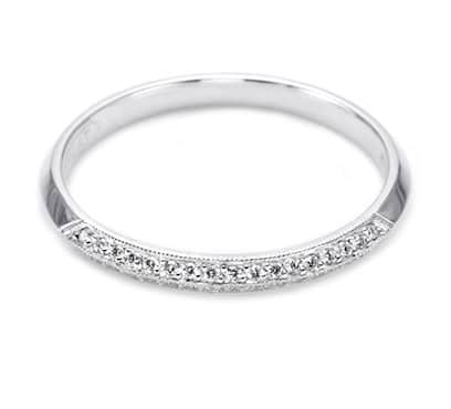 Semi-eternity Diamond Bands: These bands have diamonds which go only half way around the ring, enabling for the most beautiful part to be accentuated. Semi-eternity bands can accommodate slightly larger stones and are usually more affordable than their full counterpart. When considering diamond size, note that if the stones are quite large, they can compete with the engagement ring’s attention and can look more like a nine stone diamond ring instead of a band. Either way, the semi-eternity band can be a dazzling addition to an engagement ring or on its own as a wedding band.