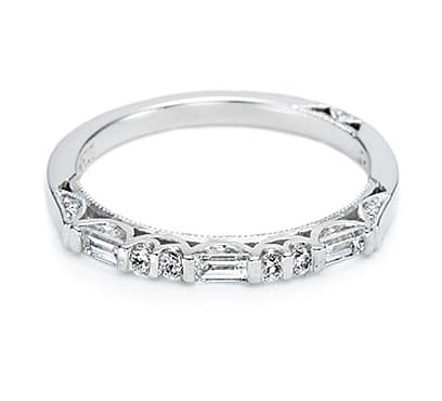 Channel-set Diamond Bands: Beautiful alone or complimenting an engagement ring, channel set diamond bands offer a secure way to showcase the sparkling stones. The diamonds can be many different shapes, including princess, round, emerald or any other number of shapes.