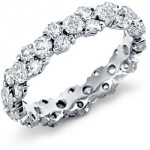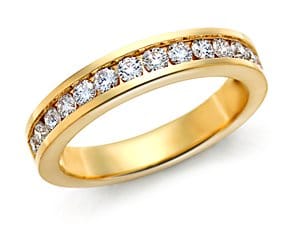 Full Eternity Diamond Bands: These are a stunningly beautiful ring worn alone or complimenting an engagement ring. It is highly symbolic of the eternal nature of marriage for many people. With a complete circle of diamonds, it is easily showcased from all angles if it rotates. Because it has diamonds all around the band, it is important to get the correct size since it cannot be adjusted after it is made. Depending on the size of the diamonds used, eternity diamond bands can be expensive due to the sheer number of diamonds.