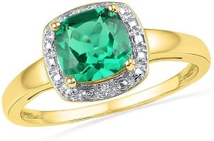 Solid 10k Yellow Gold Cushion Round Green Simulated Emerald and White Diamond Engagement Ring OR Fashion Band Prong Set Solitaire Shaped Halo Ring (.01 cttw)