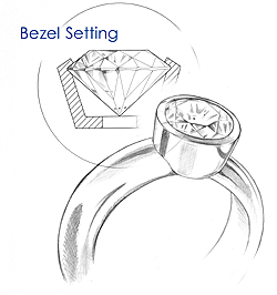 Bezel: The diamond is housed deeper into the setting, making it flush (or almost flush) with the rest of the band. An excellent choice for those with an active lifestyle since it keeps the diamond more protected.