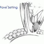 Pave: Many small diamonds or gemstones are set continuously in miniature prongs along the sides of the band or around the center stone, making for a glamorous and sparkling effect.