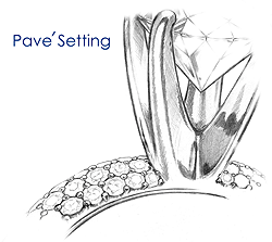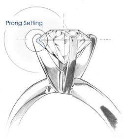 Prong: Traditionally, the four or six prong settings allow the stone to be showcased most effectively. Larger stones will generally be set with six prongs for additional security.