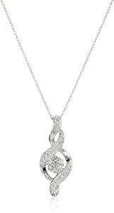 - A diamond-accented twisted infinity pendant with a cluster of diamonds dangling in the center hangs on a 10k white gold necklace.