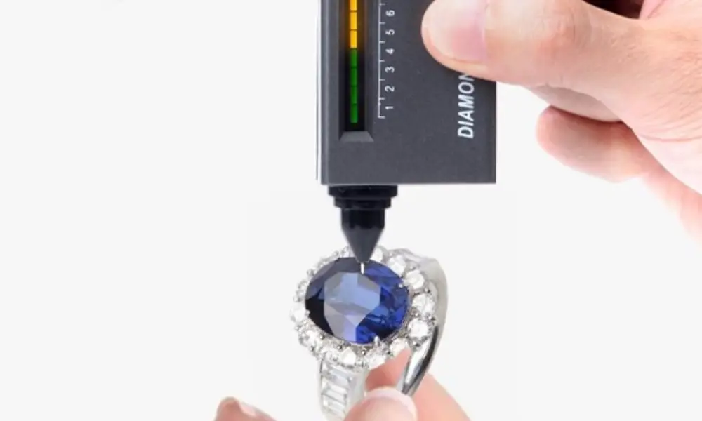 Diamond testers are usually small rectangular devices with a built-in light display and a pointy tip similar to a needle; this tip needs to be placed on the gemstone. If it is an authentic diamond, it would indicate that with a light or a sound. You have to gently place the needle on the stone for a couple of seconds. The diamond tester would calculate the thermal conductivity of the stone, and if it is an actual diamond, it will give off beeping sounds accompanied by a red or green light.