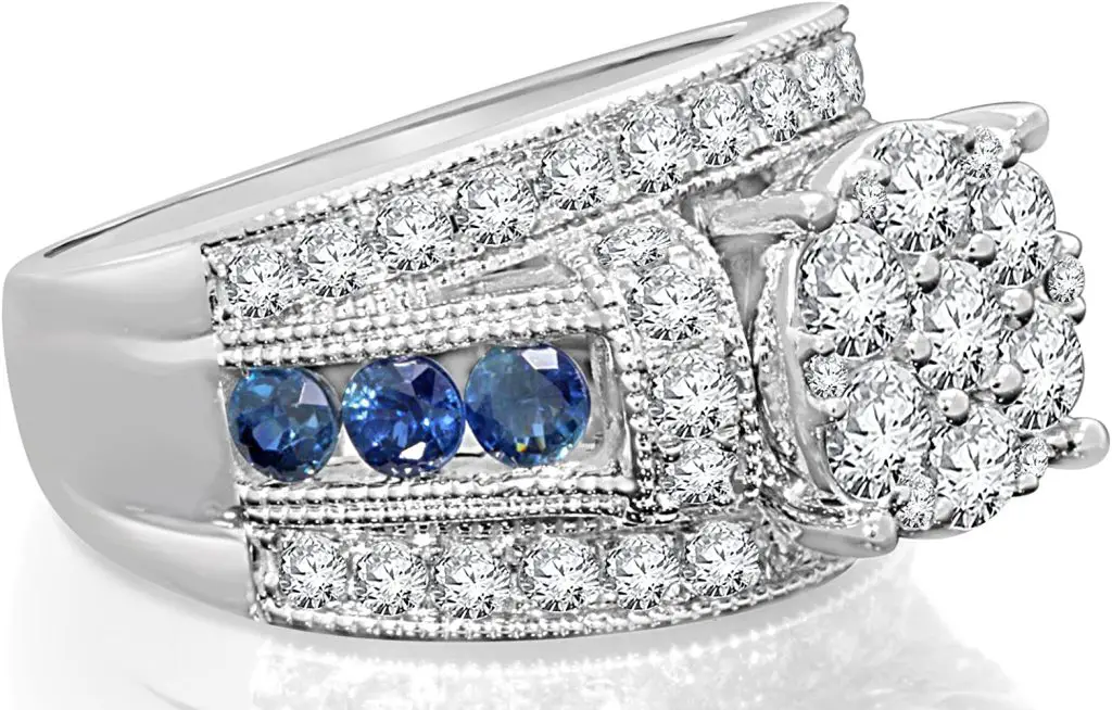 10K White Gold, 3.26 Carat Real Diamond and Sapphire Halo Channel Diamond Bridal Ring with Sapphire Genuine Fine Diamond Wedding Rings for Women