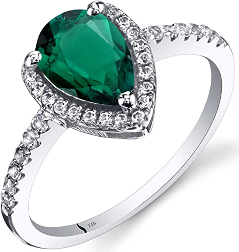 14K White Gold Created Emerald Open Halo Ring Pear Shape 1.25 Carats Sizes 5 to 9