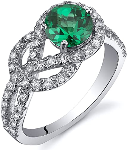 - INFINITELY STUNNING – The Sterling Silver Infinity Knot Ring is a one-of-a-kind piece that will make her feel special. Peora Simulated Emerald, Round Shape, 6mm, 0.75 Carat, set in an infinity knot halo with fine White Cubic Zirconia accents. This Simulated Emerald Ring is absolutely gorgeous, and it’s a stunning and one-of-a-kind engagement, promise, cocktail, or statement ring.