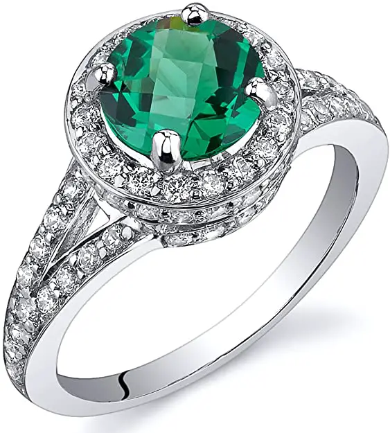 - EXQUISITE DESIGN – This vintage halo ring for women is stunning. With its unusual design and 1.25 carats of Peora Simulated Emerald, this Sterling Silver Ring will turn heads. Premium Grade Cubic Zirconia surrounds its 7mm Round Shape center stone in a classic halo style that is timeless and stylish while remaining discreet enough to wear every day. It’s a stunning and one-of-a-kind engagement, promise, cocktail, or statement ring.