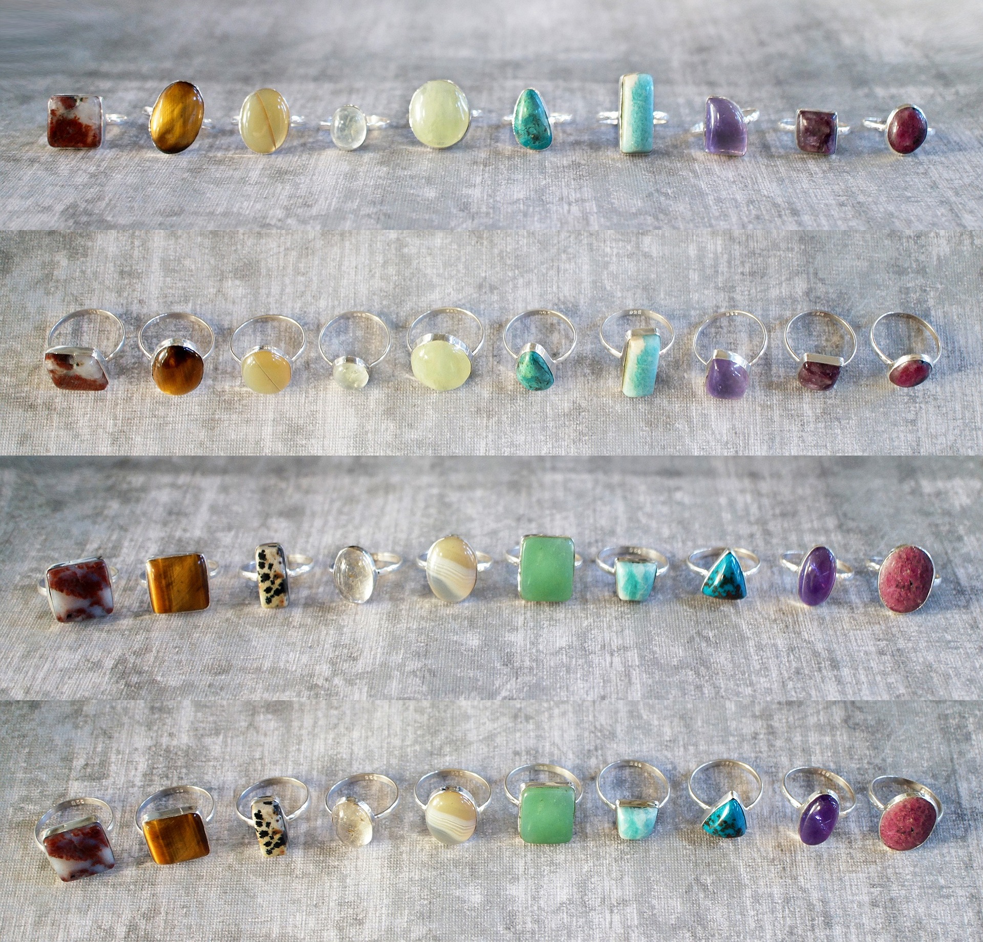 Each different colored gemstone will be set in a traditional bezel, with silver around it completely on all sides.