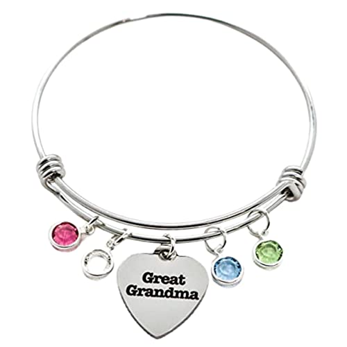 - * Personalized Swarovski Birthstones (Up to 9, Minimum 1) * Stainless Steel Bangle PRODUCT DETAILS: * Great Grandma Heart Pendant * Personalized Swarovski Birthstones (Up to 9, Minimum 1)