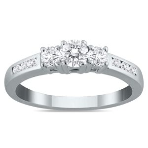 - A traditional three-stone ring in 10K white gold with channel set side diamonds.