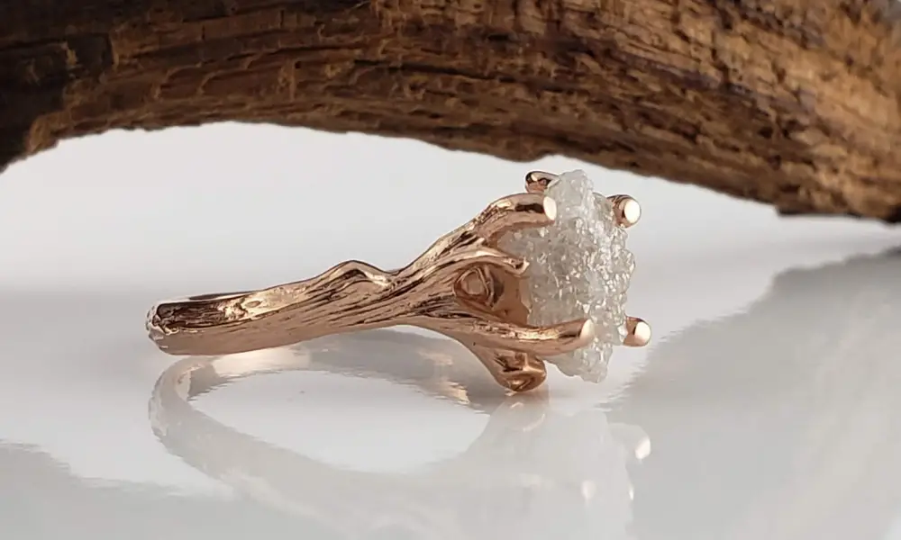 An engagement ring made of rough diamonds is unquestionably the best option if you want something that will turn heads while also unique to you. Stunning settings for raw diamonds are available, ranging from coppery rings resembling branches to discreet gold bands or vintage pieces accompanied by other complementary gemstones.