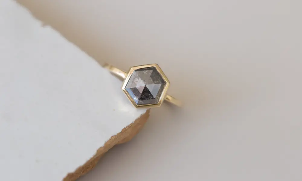 Salt and pepper diamonds complement a wide range of ring styles, from vintage to modern. They look great in rustic settings like this raw rose cut diamond ring or traditional settings like this hexagon side stone ring, and they fit both minimalist and maximalist styles. Salt and pepper diamonds are a great choice for any fashion sense because of their adaptability.