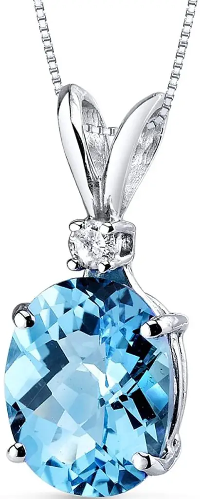 - WOMEN’S CLASSIC BLUE TOPAZ JEWELRY – With our Peora 14K Gold Pendants Collection, we’ve given the traditional solitaire favorite a vibrant twist. Natural Peora Swiss Blue Topaz, Oval Shape, 10x8mm, 2.85 Carats with its characteristic Lagoon Blue tint for a sumptuous radiance. A genuine Round Brilliant Cut Diamond, 0.05 carat, set in 14 Karat White Gold for maximum sparkle, punctuates the stone’s appealing checkboard faceting.
